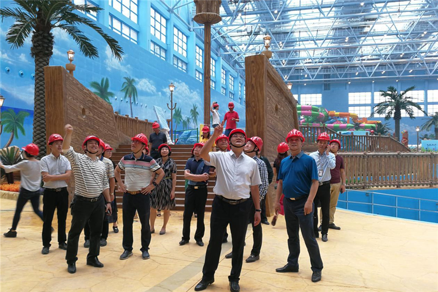 参观中,陈家飞主席对文旅城能否于6月15日开业等问题以及文旅城周边的道路交通等配套设施建设情况进行逐一询问。融创文旅城谢剑波副总经理和交通运输局的同志分别介绍了有关建设情况。