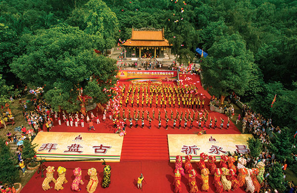 King Pan Gu Park is located inthe north of Shiling Town, Huadu District, which is very urique. It has been one of the "Eight Scenic Spots of Hua County" in Qing Dynasty. and is called "Pan Gu Haze". Temple of King Pan Gu has been having endless stream of pilgrims over the years and is known far and wide. On the 12th day of eighth lunar month each year, which is the birthday of King Pan Gu, devout men and women all over the country would gather incrows and groups. beating drums and performing lion dance, solemnizing the event. Ten thousands of people came from far and near to worship King PanGu.