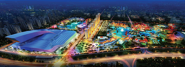 Wanda Cultural and Tourist City in Guangzhou was initiated in 2014, and is planned to finish and open in 2019. The project strives to create the world­ first extra-large cultural complex of tourism and business, among which the major commercial activities of the Cultural Tourism Area include: the Indoor Skiing Park, the Outdoor Theme Park, the "Yue Show" Show Field, Technology Paradise of Movies, the Indoor Water Park, the Wanda Complex of Culture, Tourism and Business, the Starred Hotel Complex, and the Bin Lake Bar Street.
