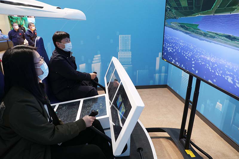 观众在“奋进新时代”主题成就展第八单元“坚持走中国特色强军之路 全面推进国防和军队现代化”展厅体验直升机综合程序训练器互动体验装置(10月12日摄)。新华社记者 许雅楠 摄