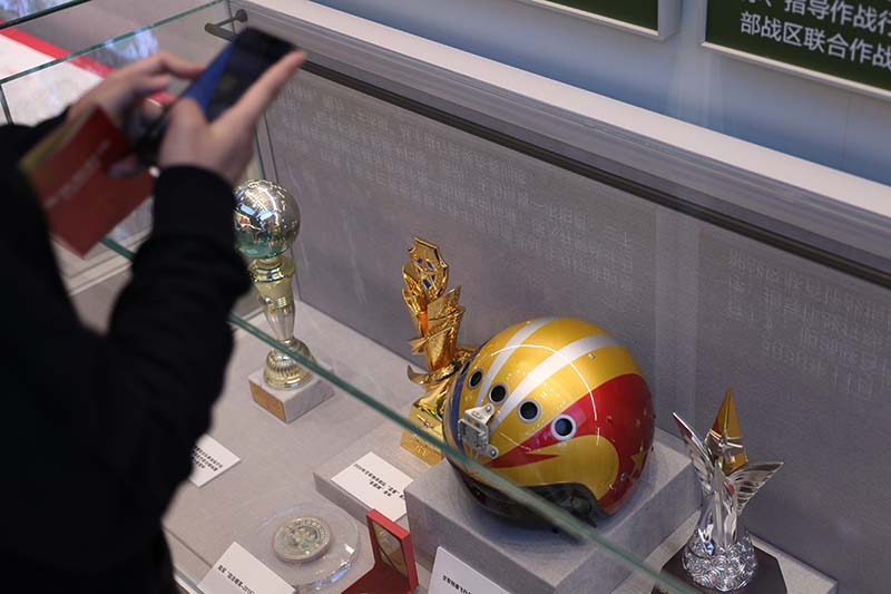 观众在“奋进新时代”主题成就展第八单元“坚持走中国特色强军之路 全面推进国防和军队现代化”展厅拍摄空军特级飞行员蒋佳冀夺得的金头盔(10月12日摄)。新华社记者 许雅楠 摄