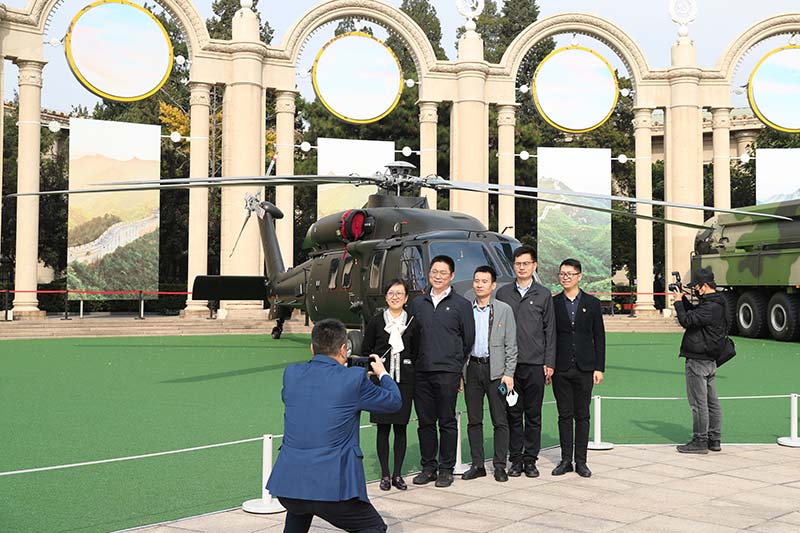 观众在“奋进新时代”主题成就展室外展区与直升机合影(10月12日摄)。新华社记者 许雅楠 摄