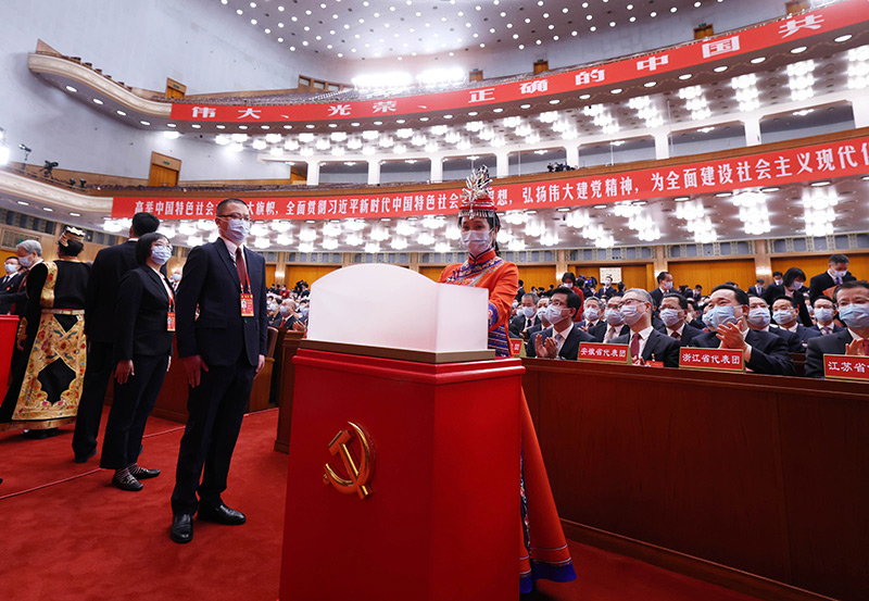 10月22日,中国共产党第二十次全国代表大会闭幕会在北京人民大会堂举行。这是代表投票选举。