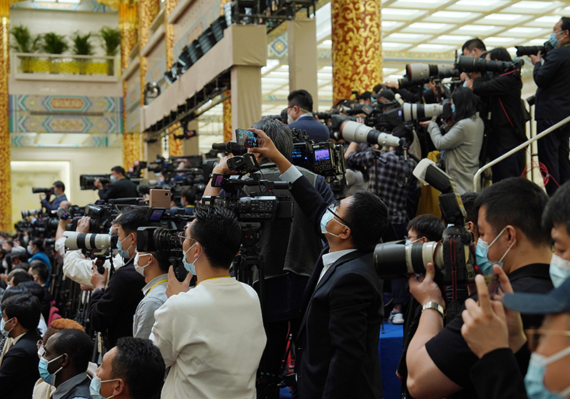 10月23日,中外记者在北京人民大会堂报道新一届中共中央政治局常委首次集体亮相。