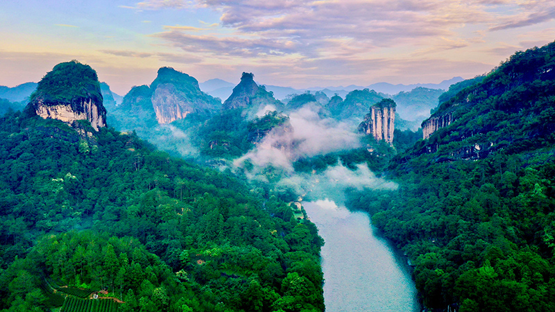 这是福建武夷山九曲溪两岸的丹霞景观(2022年6月7日摄,无人机照片)。新华社记者 姜克红 摄