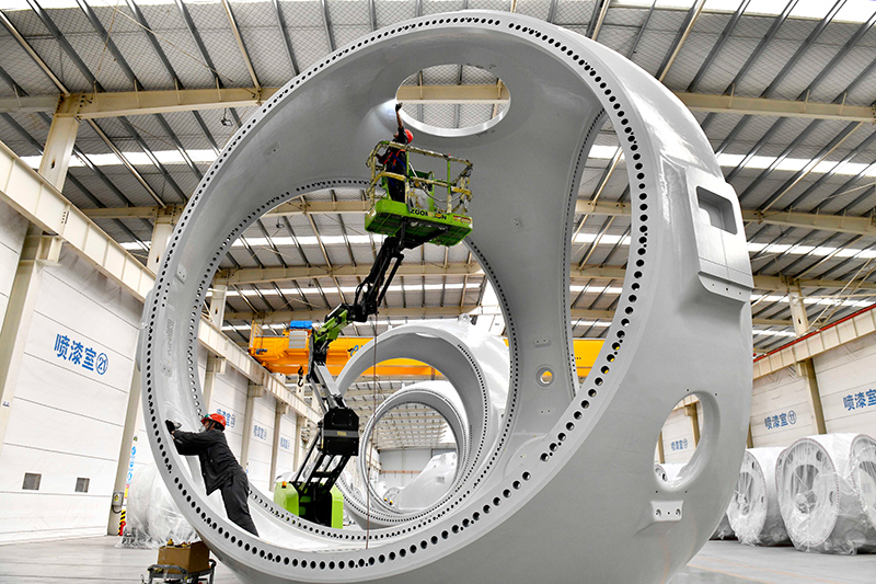 在山东省惠民县风电装备产业基地涂装车间,工作人员对风电轮毂进行涂装(2022年6月7日摄)。新华社记者 郭绪雷 摄