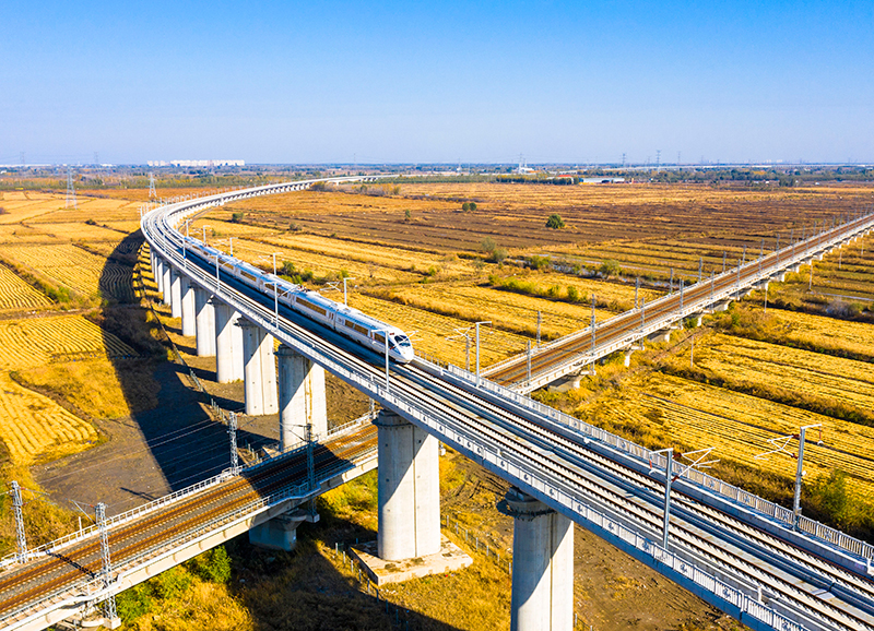 这是在天津北辰区拍摄的动车组列车行驶在京滨城际铁路宝坻至北辰段(2022年11月4日摄,无人机照片)。新华社发(李佳骏 摄)