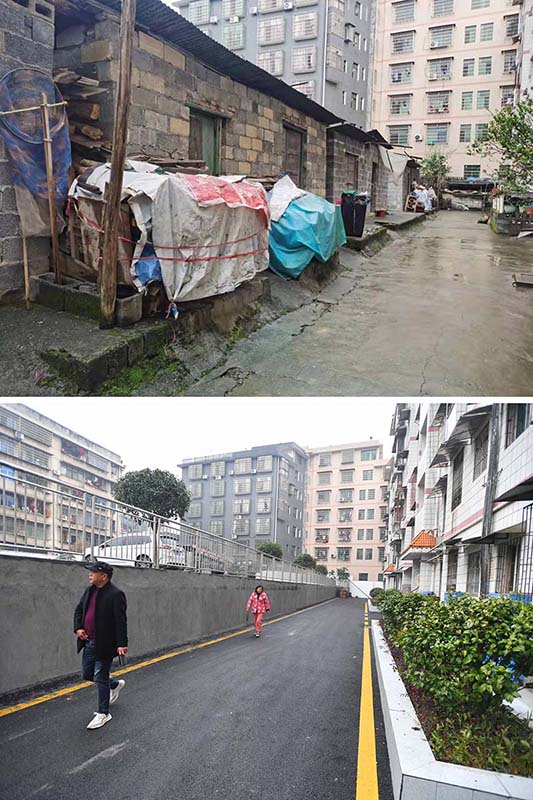 拼版照片:上图是改造前的吉首市乾州街道蔬菜社区化工厂宿舍一角(2021年11月12日摄);下图是2022年3月5日,居民在改造后的化工厂宿舍行走(新华社记者陈泽国摄)。新华社发