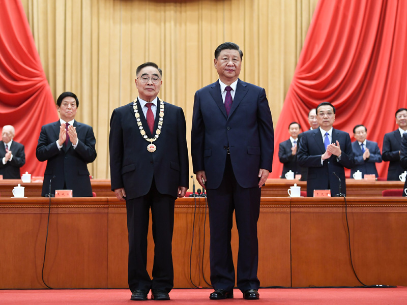栗战书宣读习近平签署的中华人民共和国主席令。主席令指出,为了隆重表彰在抗击新冠肺炎疫情斗争中作出杰出贡献的功勋模范人物,弘扬他们忠诚、担当、奉献的崇高品质,根据第十三届全国人民代表大会常务委员会第二十一次会议的决定,授予钟南山“共和国勋章”,授予张伯礼、张定宇、陈薇“人民英雄”国家荣誉称号。