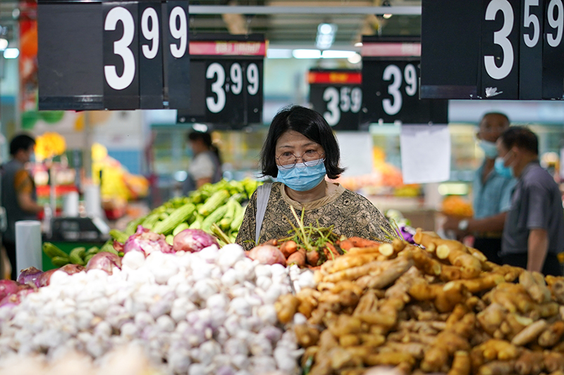 市民在江苏省无锡市经开区华润万家超市购物(2022年7月7日摄)。江苏省无锡市在做好疫情防控的同时,积极制定相关方案,制作城市保供地图,组织大型商超、市场正常运营,全力保供稳价,端稳市民“菜篮子”。