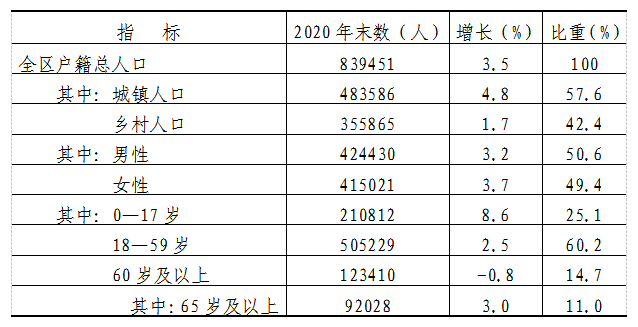 2020年末,全区户籍人口83.95万人,比上年增长3.5%,其中,城镇户籍人口48.36万人,乡村户籍人口35.59万人;男女性别比(以女性为100)为102.3,家庭户均人数3.04人。全年出生人口11554人,出生率14.24‰;死亡人口4140人,死亡率5.10‰;自然增长人口7414人,人口自然增长率9.14‰。