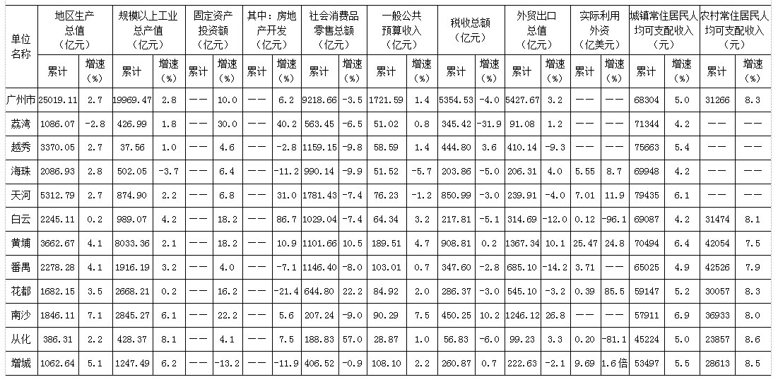 注:1、2020年数据为初步统计数; 2、从2018年起,市统计局只反馈固定资产投资(项目在地)增速,下同; 3、2016-2020年一般公共预算收入(支出)数据为财政总决算数据。 2020年1-12月广州市各区主要经济指标对比表
