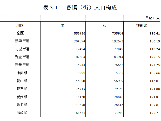 根据第七次全国人口普查结果,现将2020年11月1日零时我区10个镇(街)的人口性别构成情况公布如下: