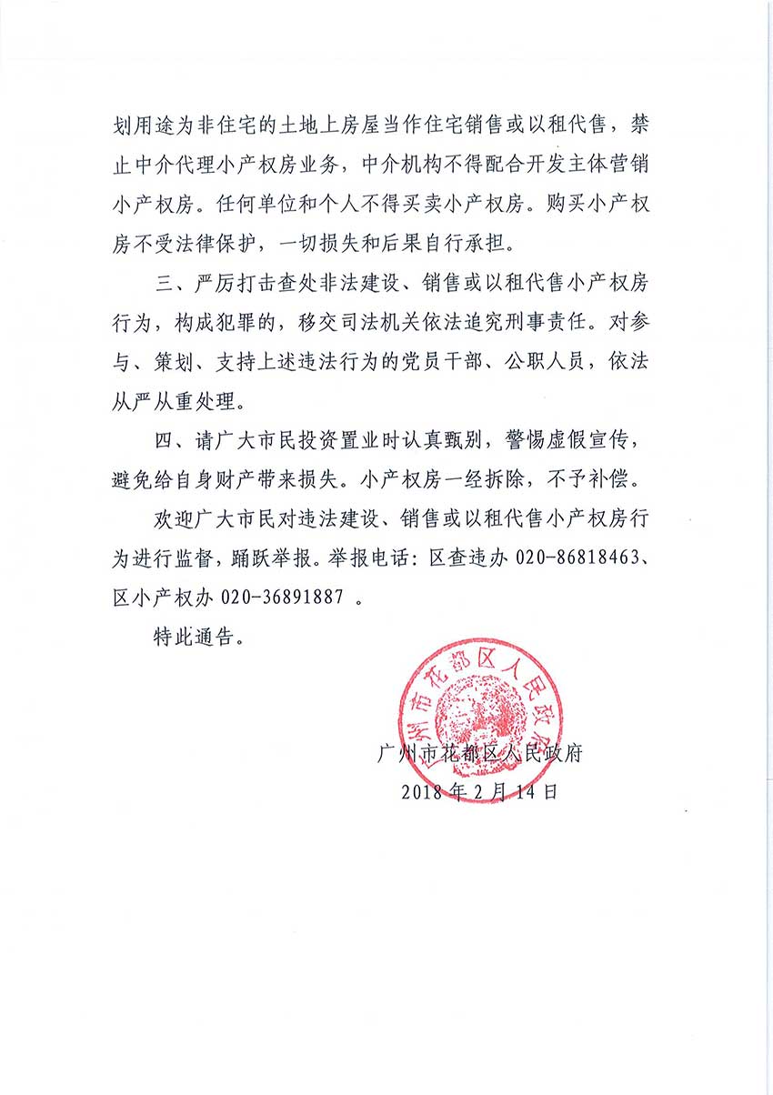 澳门金沙娱乐城官网关于坚决遏制非法建设、销售或以租代售小产权房的通告【花府〔2018〕3号】