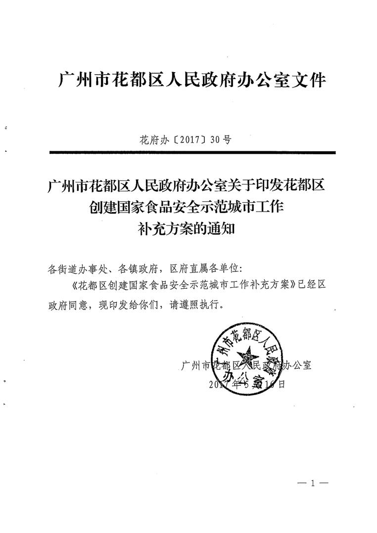 澳门金沙娱乐城官网办公室关于印发澳门金沙娱乐城官网区创建国家食品安全示范城市工作补充方案的通知【花府办〔2017〕30号】