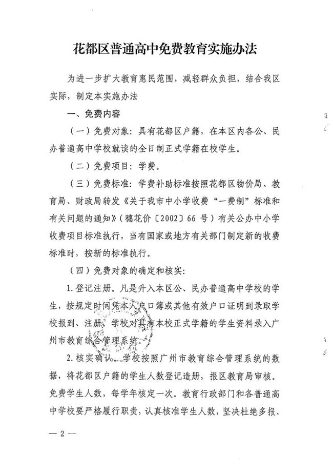 澳门金沙娱乐城官网办公室关于印发澳门金沙娱乐城官网区普通高中免费教育实施办法的通知【花府办[2016]1号】