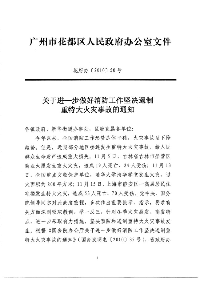 关于进一步做好消防工作坚决遏制重特大火灾事故的通知 【花府办[2010]50号】