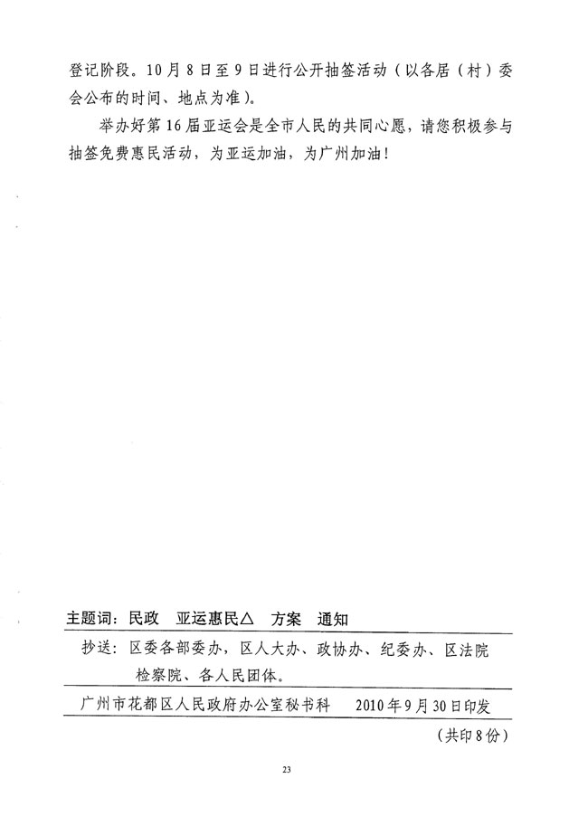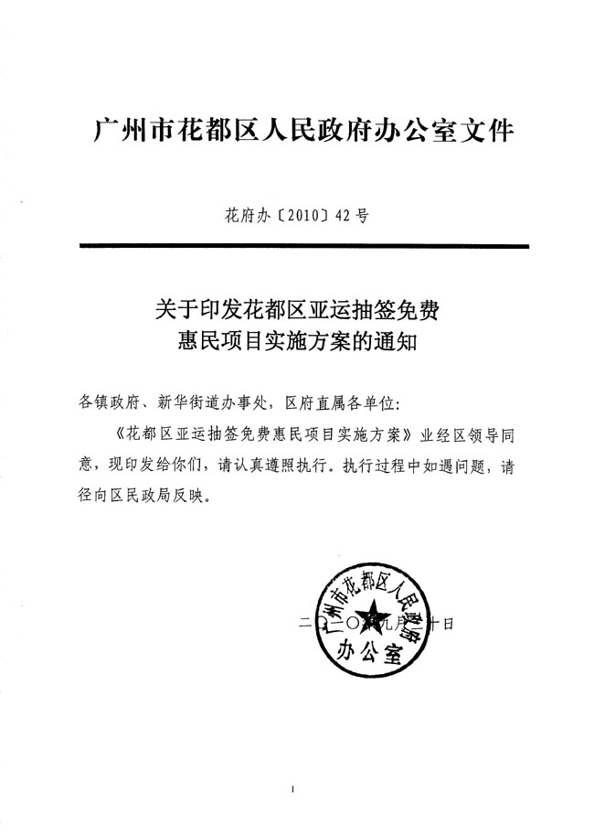 关于印发澳门金沙娱乐城官网区亚运抽签免费惠民项目实施方案的通知 【花府办[2010]42号】