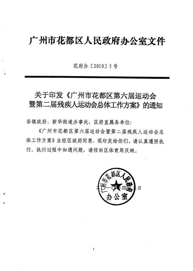 关于印发《澳门金沙娱乐城官网第六届运动会暨第二届残疾人运动会总体工作方案》的通知 【花府办[2010]5号】