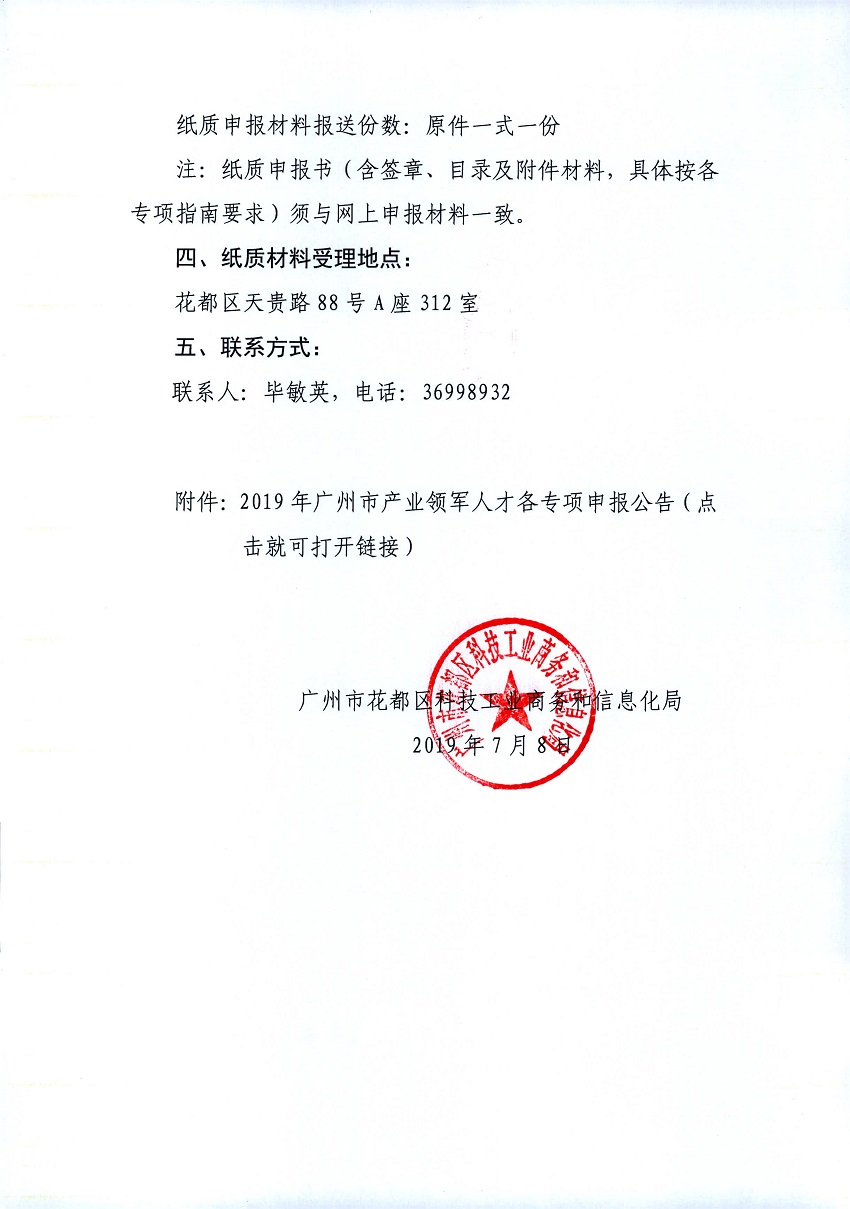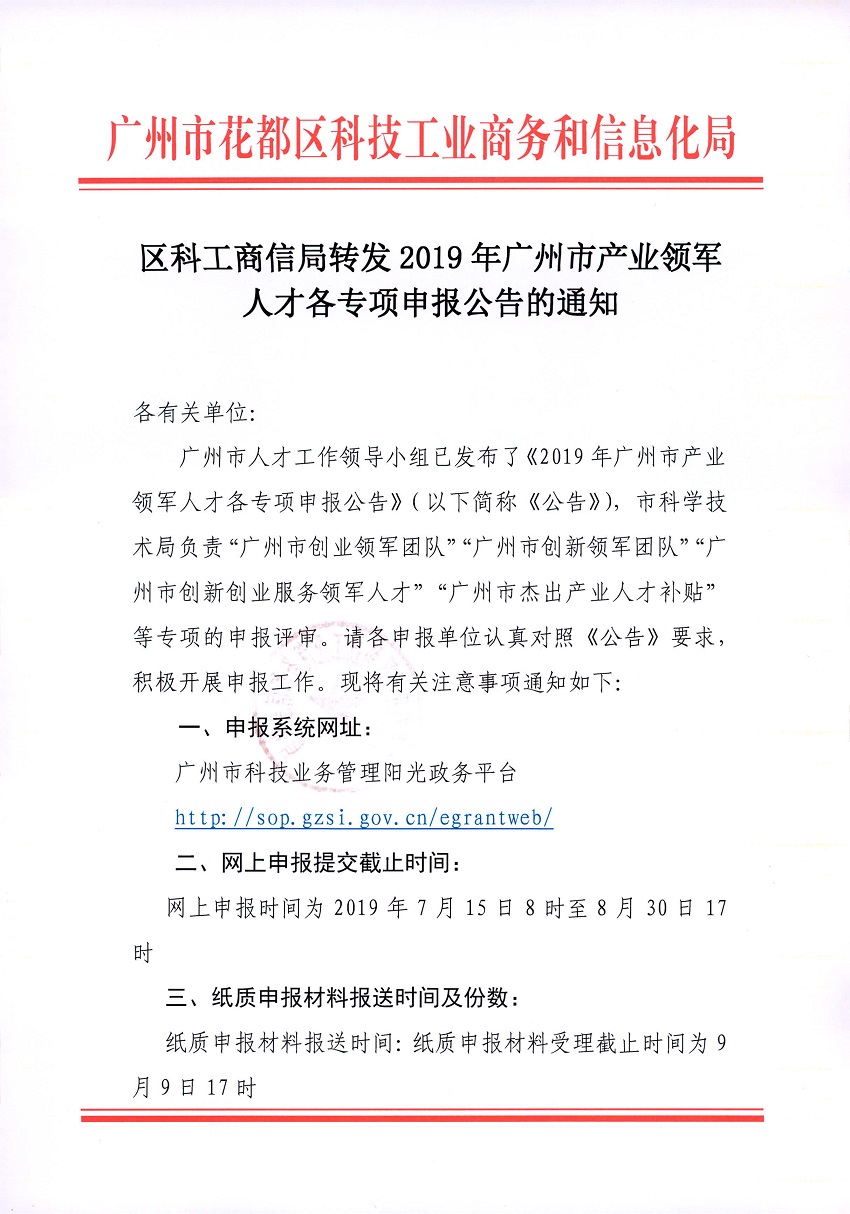 区科工商信局转发2019年广州市产业领军人才各专项申报公告的通知