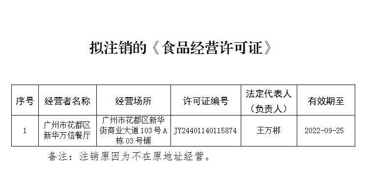 根据《食品经营许可管理办法》第三十七条“食品经营者未按规定申请办理注销手续的,原发证的食品药品监督管理部门应当依法办理食品经营许可注销手续”等规定,现将拟注销的《食品经营许可证》予以公示(后附列表),公示期为30个工作日。相关经营者如在公示期内有异议,请与澳门金沙娱乐城官网食品药品监督管理局审批科联系(联系电话:020-36888091)。