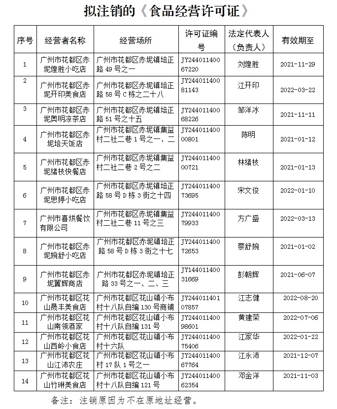 根据《食品经营许可管理办法》第三十七条“食品经营者未按规定申请办理注销手续的,原发证的食品药品监督管理部门应当依法办理食品经营许可注销手续”等规定,现将拟注销的《食品经营许可证》予以公示(后附列表),公示期为30个工作日。相关经营者如在公示期内有异议,请与澳门金沙娱乐城官网食品药品监督管理局审批科联系(联系电话:020-36888091)。