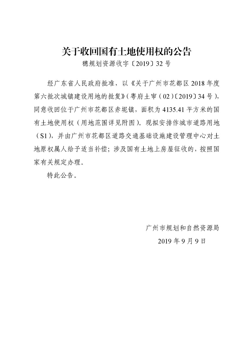 关于收回国有土地使用权的公告(穗规划资源收字〔2019〕32号)