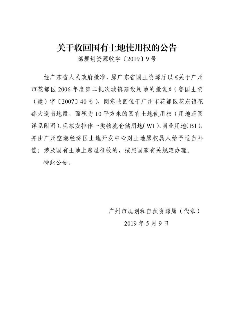 收回国有土地使用权的公告(穗规划资源收字〔2019〕9号)