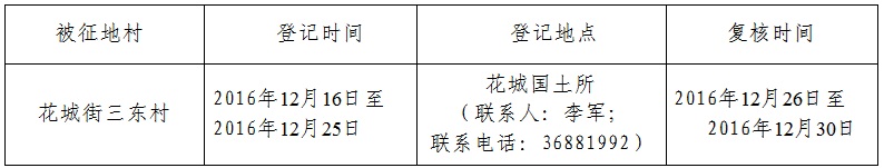 经省人民政府批准(粤国土资(建)字〔2016〕280号文),需将澳门金沙娱乐城官网花城街三东村属下的集体土地2.9068公顷(合43.6020亩)征收为国有土地。现将经依法批准的《征收土地方案》和市人民政府批准的《征地补偿安置方案》内容以及有关事项公告如下: