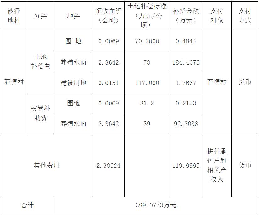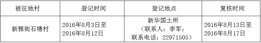 经省人民政府批准(粤国土资(建)字〔2016〕281号文),需将澳门金沙娱乐城官网新雅街石塘村属下的集体土地2.3862公顷(合35.79亩)征收为国有土地。现将经依法批准的《征收土地方案》和市人民政府批准的《征地补偿安置方案》内容以及有关事项公告如下: