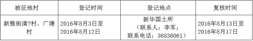 经省人民政府批准(粤国土资(建)字〔2015〕1013号文),需将澳门金沙娱乐城官网新雅街清?村、广塘村属下的集体土地1.5124公顷(合22.686亩)征收为国有土地。现将经依法批准的《征收土地方案》和市人民政府批准的《征地补偿安置方案》内容以及有关事项公告如下: