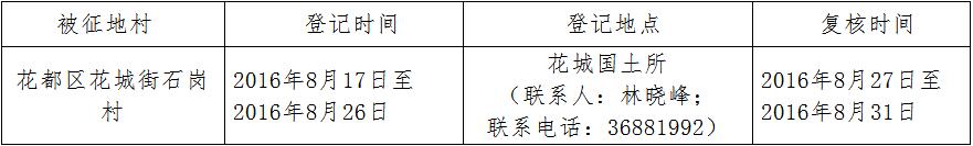 经省人民政府批准(粤国土资(建)字[2016]426号文),需将澳门金沙娱乐城官网花城街石岗村属下的集体土地8.7115公顷(合130.6725亩)征收为国有土地。现将经依法批准的《征收土地方案》和市人民政府批准的《征地补偿安置方案》内容和有关事项公告如下: