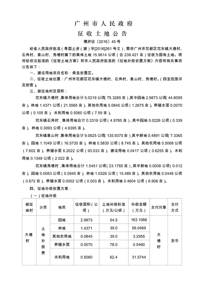 广州市人民政府征收土地公告——穗府征〔2016〕45号