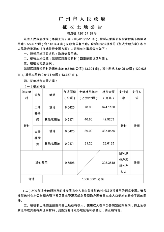 广州市人民政府征收土地公告——穗府征〔2016〕39号